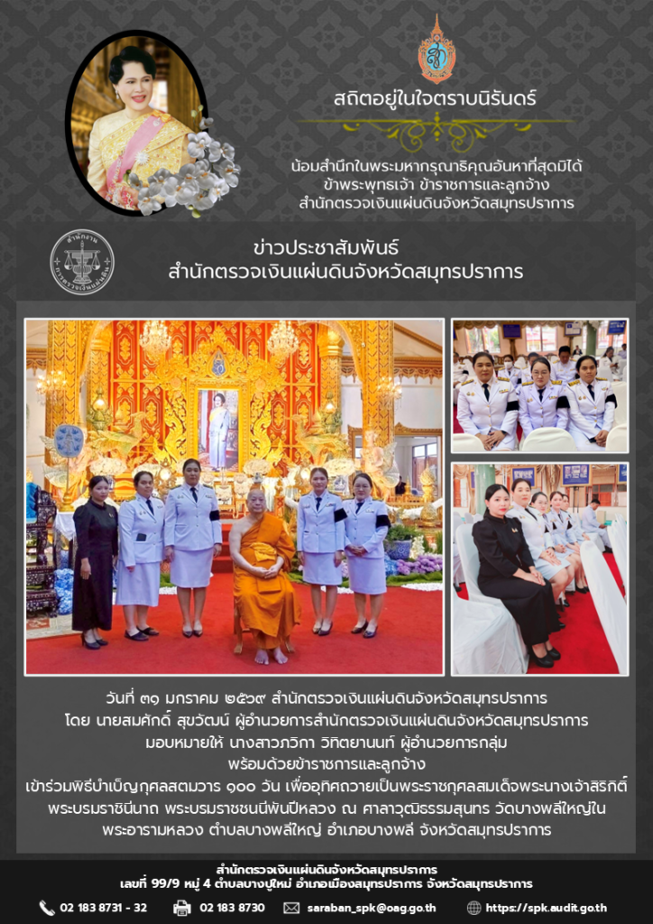 วันที่ ๓๑ มกราคม ๒๕๖๙ สำนักตรวจเงินแผ่นดินจังหวัดสมุทรปราการโดย นายสมศักดิ์ สุขวัฒน์ ผู้อำนวยการสำนักตรวจเงินแผ่นดินจังหวัดสมุทรปราการมอบหมายให้ นางสาวภวิกา วิทิตยานนท์ ผู้อำนวยการกลุ่มพร้อมด้วยข้าราชการและลูกจ้างเข้าร่วมพิธีบำเบ็ญกุศลสตมวาร ๑๐๐ วัน เพื่ออุทิศถวายเป็นพระราชกุศลสมเด็จพระนางเจ้าสิริกิติ์ พระบรมราชินีนาถ พระบรมราชชนนีพันปีหลวง ณ ศาลาวุฒิธรรมสุนทร วัดบางพลีใหญ่ในพระอารามหลวง ตำบลบางพลีใหญ่ อำเภอบางพลี จังหวัดสมุทรปราการ