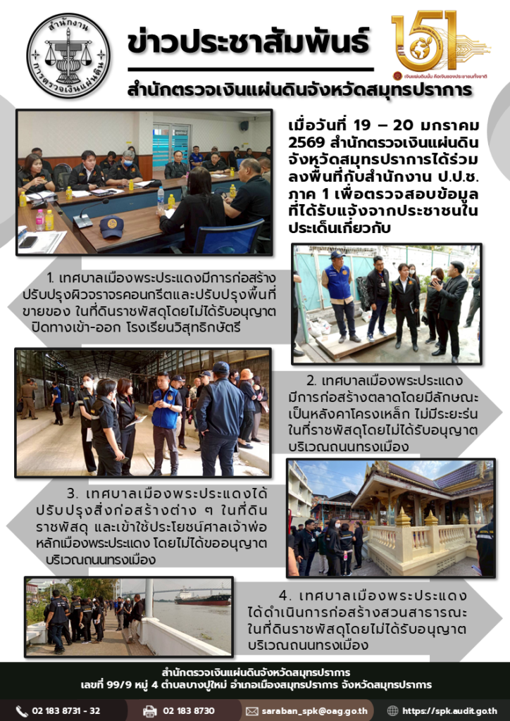 สำนักตรวจเงินแผ่นดินจังหวัดสมุทรปราการร่วมลงพื้นที่กับสำนักงาน ป.ป.ช. ภาค 1 เพื่อตรวจสอบข้อมูลที่ได้รับแจ้งจากประชาชนกิจกรรมตรวจสอบ, ภาพกิจกรรมมกราคม 21, 2026มกราคม 21, 2026 Post Views: 45